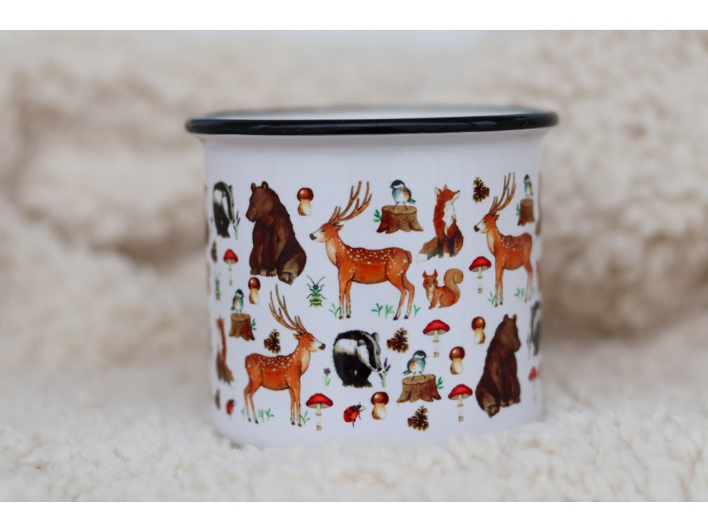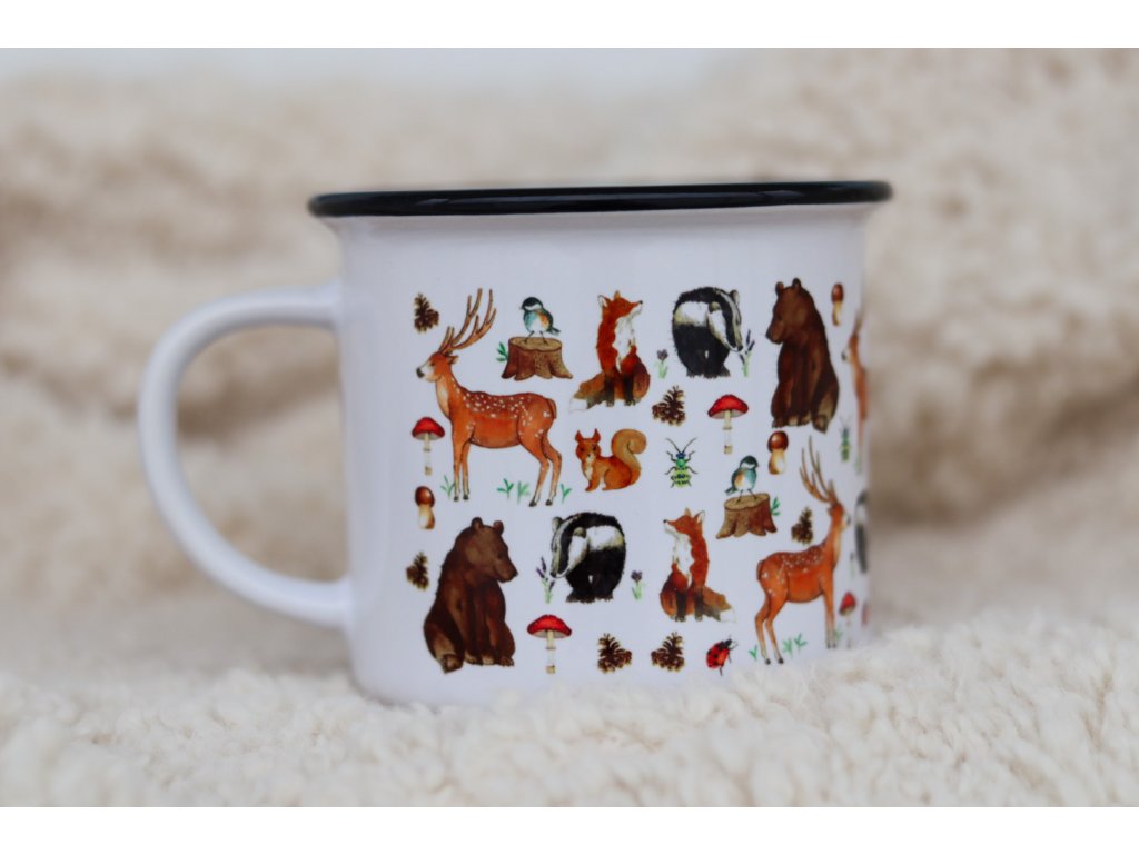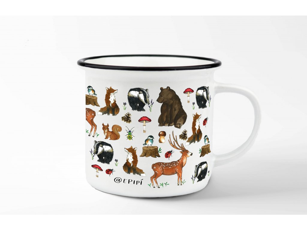 Keramický hrnek o objemu 250 ml s černým lemem, díky kterému má hrneček vzhled retro plecháčku. Hrnek je potištěný po celé ploše, potisk končí zhruba 2 cm od ucha a zdobí jej naše autorská ilustrace, která byla v originále malovaná akvarelem.