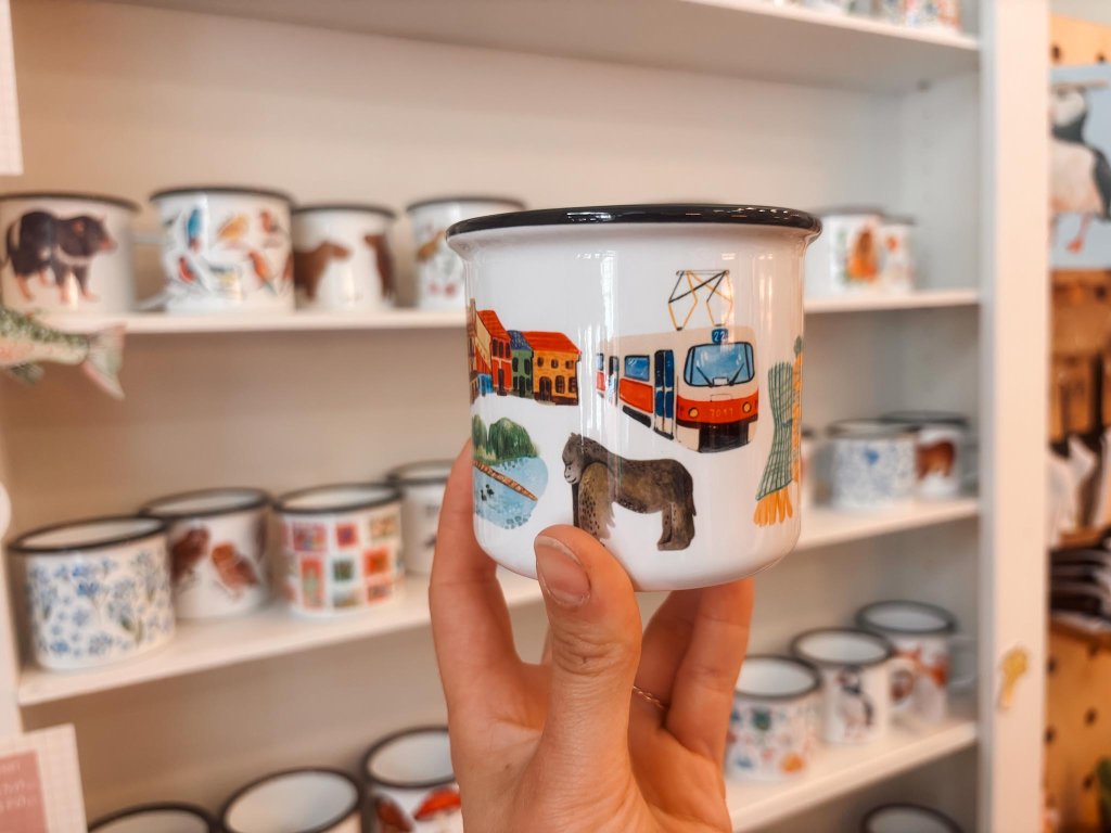 Keramický hrnek s černým lemem, díky kterému má hrneček vzhled retro plecháčku. Hrneček zdobí naše autorské ilustrace známých pražských míst a symbolů, které byly v originále malované akvarelem a pastelkami. Najdete na něm Tančící dům, Karlův most s labutěmi, tramvaj, Petřínskou rozhlednu, pražskou zoo, chlebíček nebo třeba malebnou Zlatou uličku.