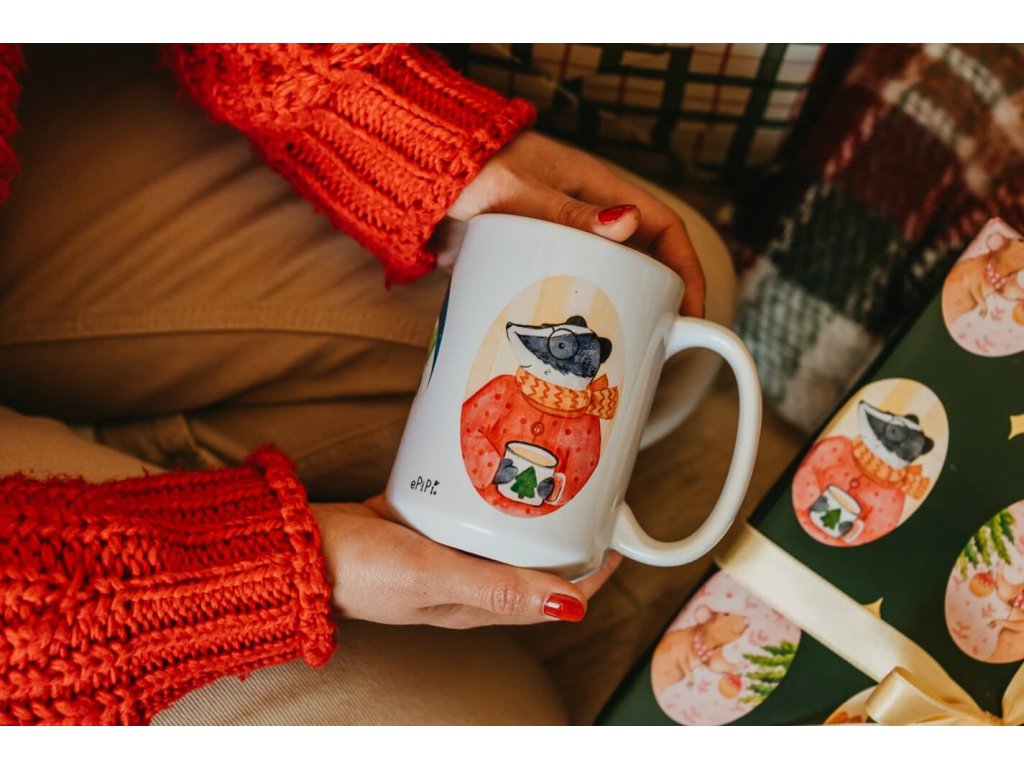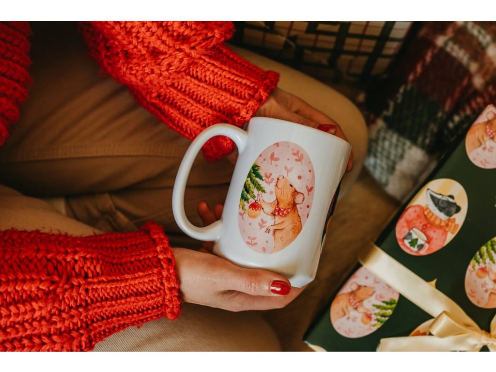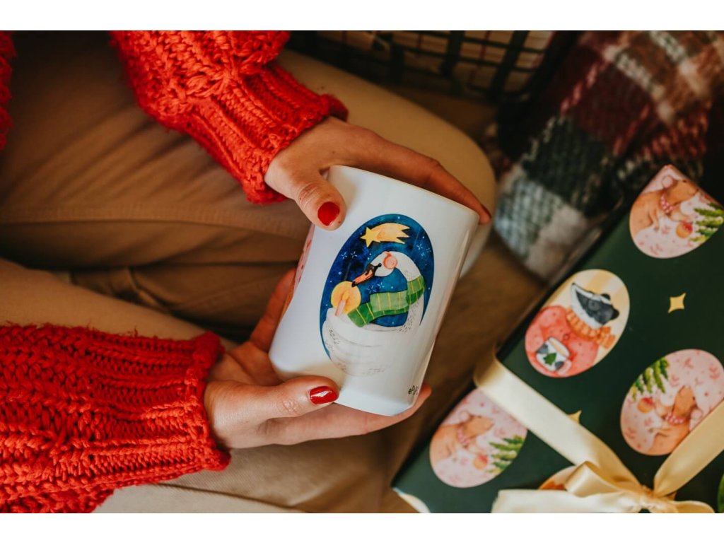 Hrnek je potištěný po celé ploše, potisk končí zhruba 1 cm od ucha a zdobí jej naše autorské ilustrace vánočních zvířátek v oválných rámečcích. Ilustrace byly v originále malované akvarelem.