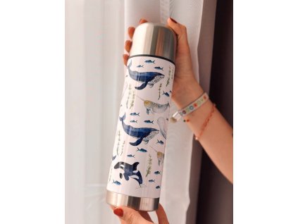 Termoska z kvalitní nerezové oceli se šroubovacím uzávěrem a vrchním uzávěrem použitelným jako kelímek na pití. Termoska je potištěná autorskou ilustrací...