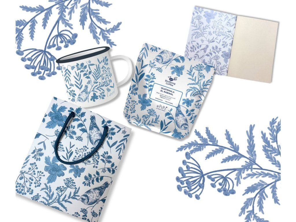 Dárková sada obsahuje plecháček v objemu 330 ml s modrým okrajem a naší autorskou ilustrací, sešit A6, zrnkovou kávu od pražské pražírny BirdSong Coffee a to vše dostanete s dárkovou taštičkou ve formátu A5 s perfektně ladícím jarním motivem.