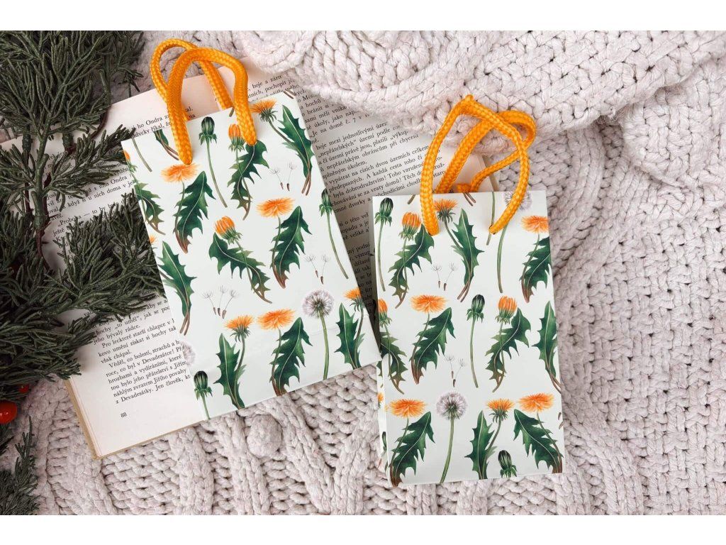 Taška určená na na jakoukoliv drobnost, kterou chcete udělat radost. Taška je potištěna motivem pampelišek a má rozměr 16 x 10 x 5 cm, vejde se do ní pohodlně formát A6.
