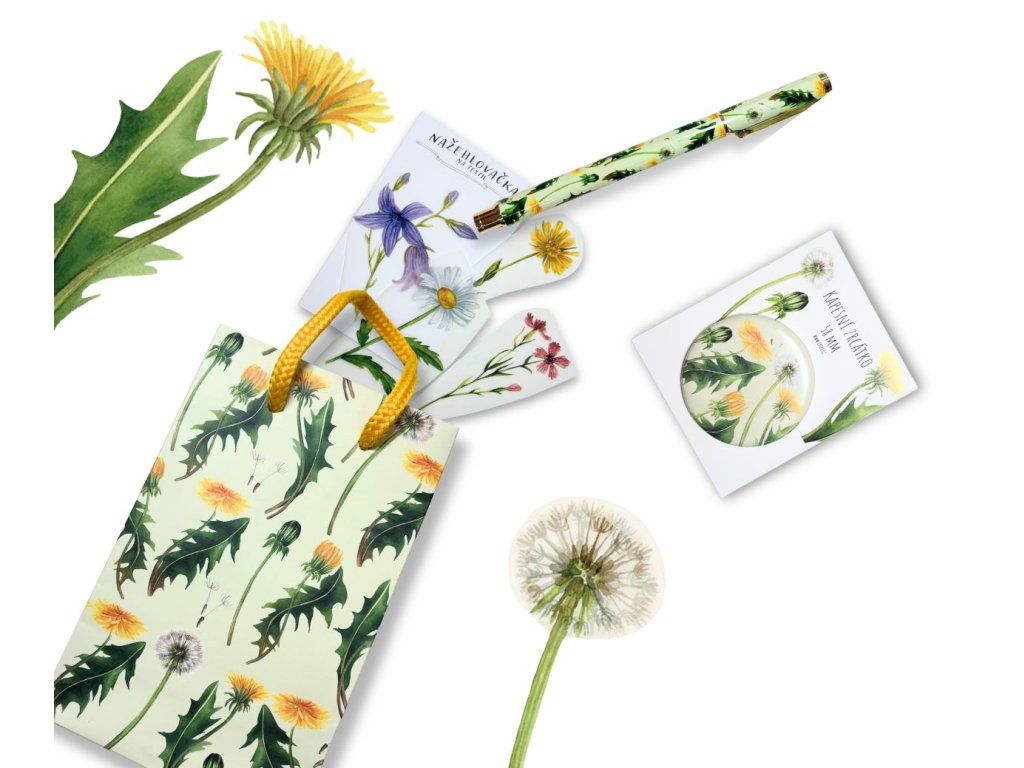 Dárková sada obsahuje kapesní zrcátko s naší autorskou ilustrací pampelišek, sadu květinových nažehlovaček, kovové pero, a to vše dostanete s dárkovou taštičkou ve formátu A6 s perfektně ladícím motivem.