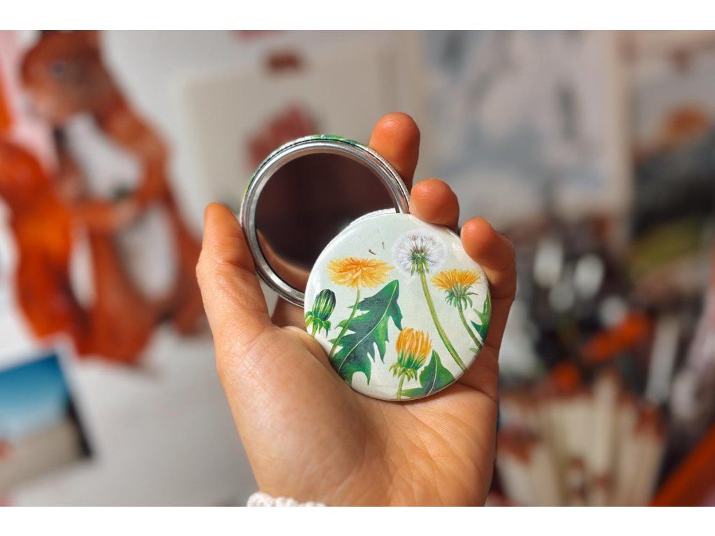 Kapesní zrcátko s autorským motivem pampelišek. Průměr 58 mm.