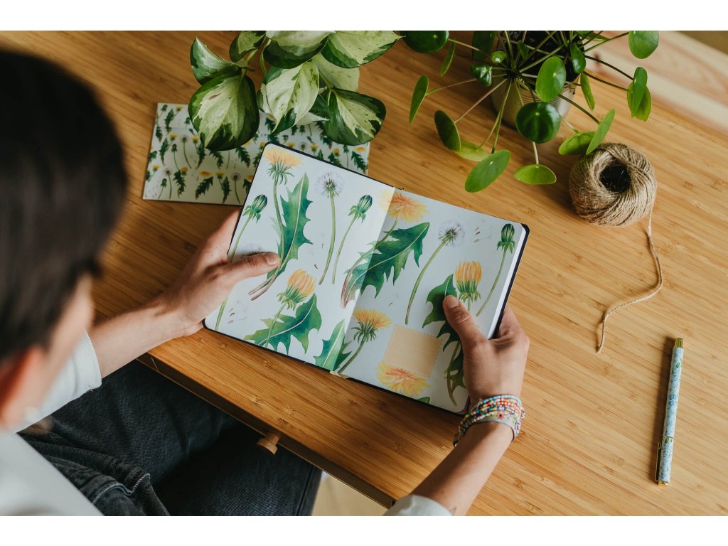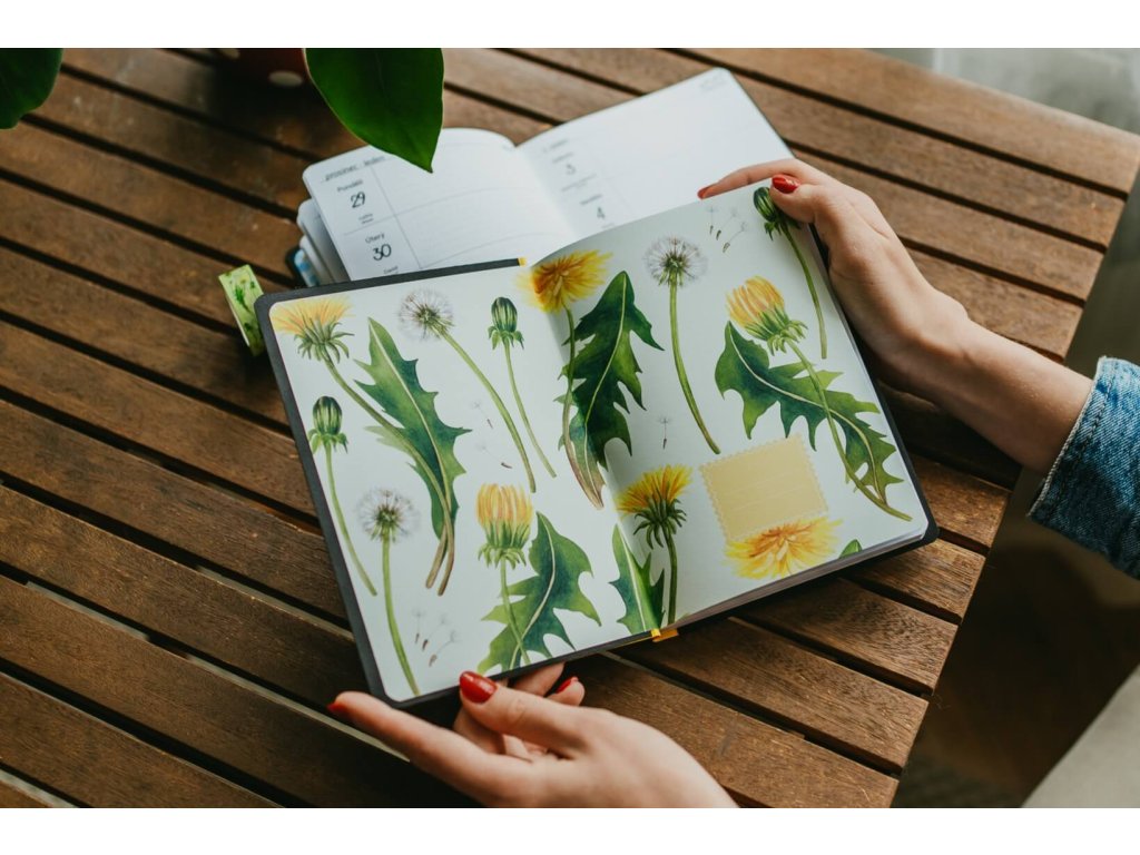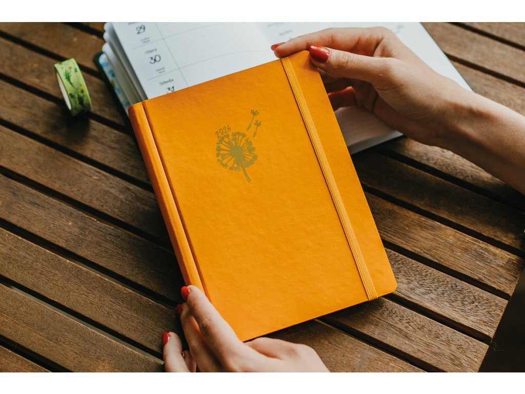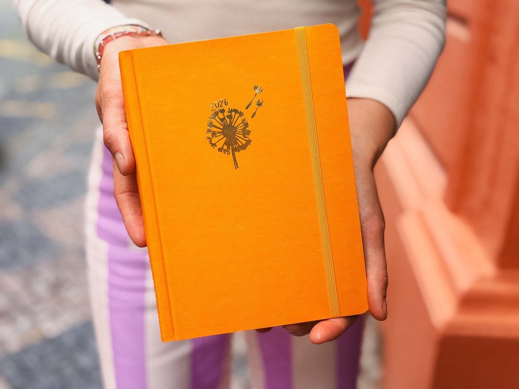 Měkké desky se zaoblenými rohy jsou vyrobeny z kvalitní eko kůže, která je na dotek příjemná a odolná. Diář je opatřen elastickou gumičkou v ladící barvě pro bezpečné zavření. Na přední straně najdeš elegantní zlatou ražbu pampelišky a rokem 2026. Jednoduché desky skvěle doplňuje ilustrovaná předsádka s pampeliškovým motivem. Velikost diáře je praktická a skladná, díky malému rozměru se vám diář vejde i do menší tašky nebo batohu a můžete jej mít neustále u sebe pro rychlé zapisování.