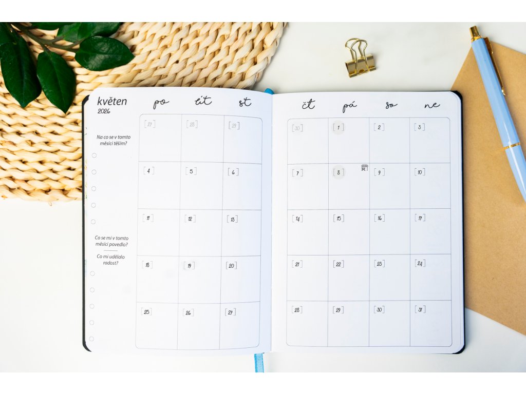 Před každým měsícem praktický přehled pro rychlé poznámky, cíle a důležité události. Skvělé se hodí pro rozvržení projektů a přehled svátků. Nechybí vyznačení státních svátků, piktogramy uzavřených obchodů, místo na rychlý
