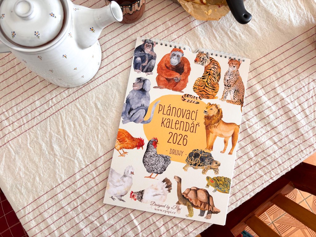 V kalendáři naleznete 12 různých druhů zvířat a květin: tučňáky, sovy, luční květiny, vážky, šelmy, motýly, opice, želvy, slepice, ryby, velryby a kachny.