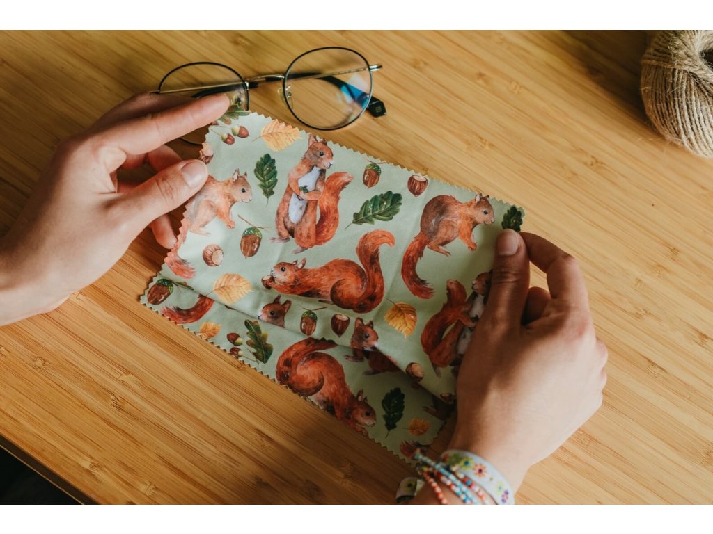 Hadřík z jemného mikrovlákna s jednostranným autorským potiskem veverek se hodí nejen na čištění brýlí, ale také displejů telefonů, obrazovek nebo jiných povrchů náchylných k poškrábání. Je šetrný, nepouští vlákna a díky velikosti 18 × 18 cm se snadno vejde do pouzdra, kabelky i batohu. Hadřík je zabalen v uzavíratelném sáčku, který chrání hadřík před nečistotami – takže je vždy připravený čistý a po ruce.