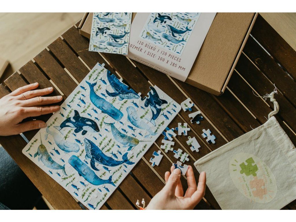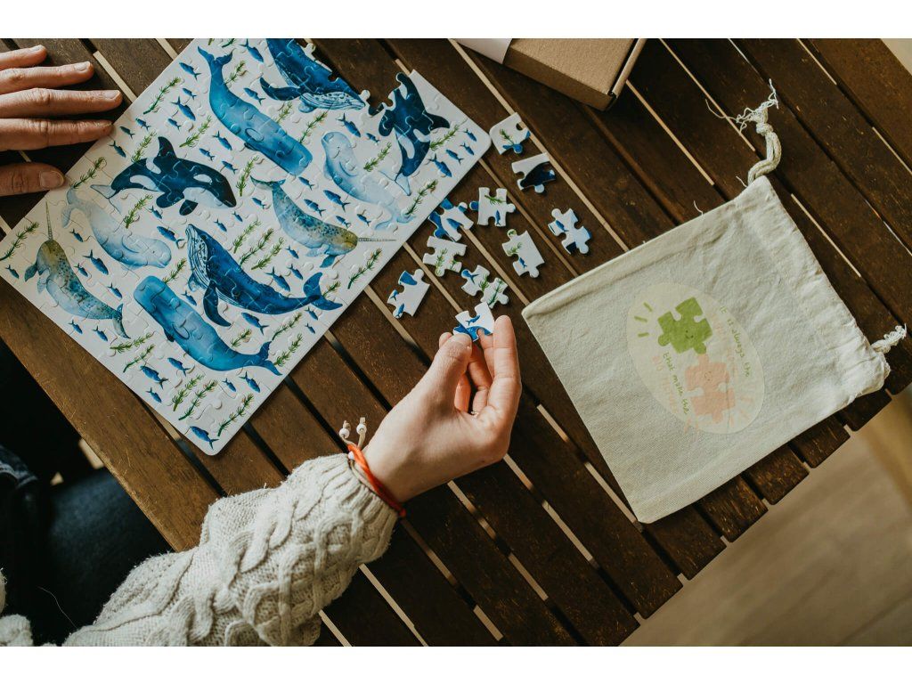 Puzzle s autorským motivem velryb jsou ideálním společníkem pro pomalé večery, kdy chcete na chvíli vypnout, zpomalit a soustředit se jen na přítomný okamžik. Každý dílek postupně zapadne na své místo a před očima vám vznikne ilustrace, která potěší nejen během skládání, ale i po jeho dokončení.