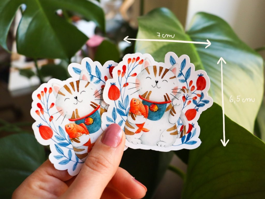 Samolepka s autorskou ilustrací, oříznutá ve tvaru japonské kočičky Maneki Neko. Samolepka je vyrobena z kvalitního PVC materiálu a je opatřena matnou laminací. Díky laminaci je samolepka vysoce odolná vůči, vodě, vlhkosti, chemikáliím, povětrnostním vlivům, slunečnímu záření, otěru, abrazi a roztržení. Ideální k dekorování jakéhokoliv povrchu - lze ji nalepit nejen do zápisníků a diářů, ale také například na telefon nebo laptop, případně je vhodná i pro dlouhodobé venkovní použití (na auto, kufr, apod.).