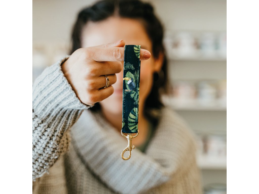 Poutko klíčenky je ušito z bavlněného kepru 225g/m2, který je digitálně potištěn akvarelovými motivy. Kovová karabina má zlatou barvu.