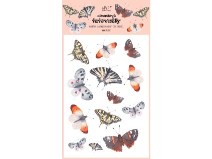 Papírové dekorativní samolepky s autorskými ilustracemi motýlů. Velikost archu A6.