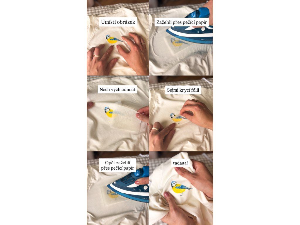 Po zažehlení nechte vše vychladnout (přibližně 60 vteřin). Začněte opatrně odlepovat fólii a ujistěte se, že se z ní obrázek úspěšně přenesl na textilii. V případě, že vytištěný obrázek na oděvu nepřilnul, znovu jej přes pečicí papír zapečte žehličkou a nechte vychladnout.