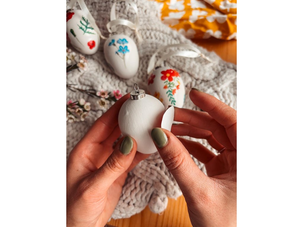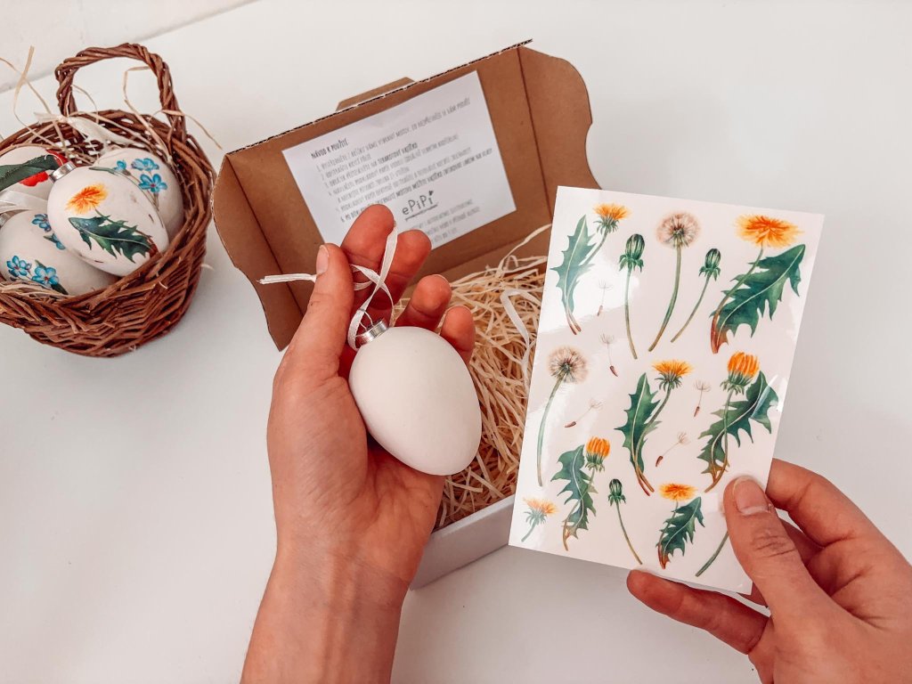 Celá sada je zabalena v bílé krabičce s dřevitou výplní. Uvnitř najdete 2 keramická terakotová vajíčka s očkem pro snadné zavěšení, stužku, 1 arch tetovacích obtisků s pampeliškami a návod, který vás provede jednoduchým tvoření. Díky tetovacím obtiskům zvládne zdobení každý.