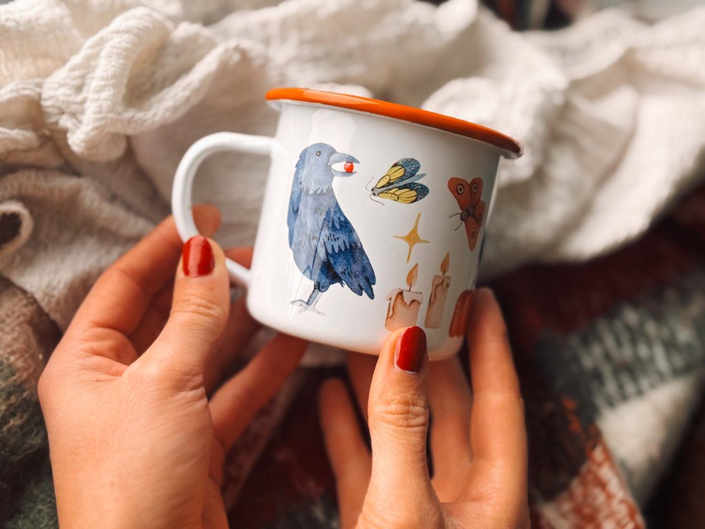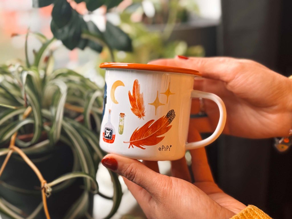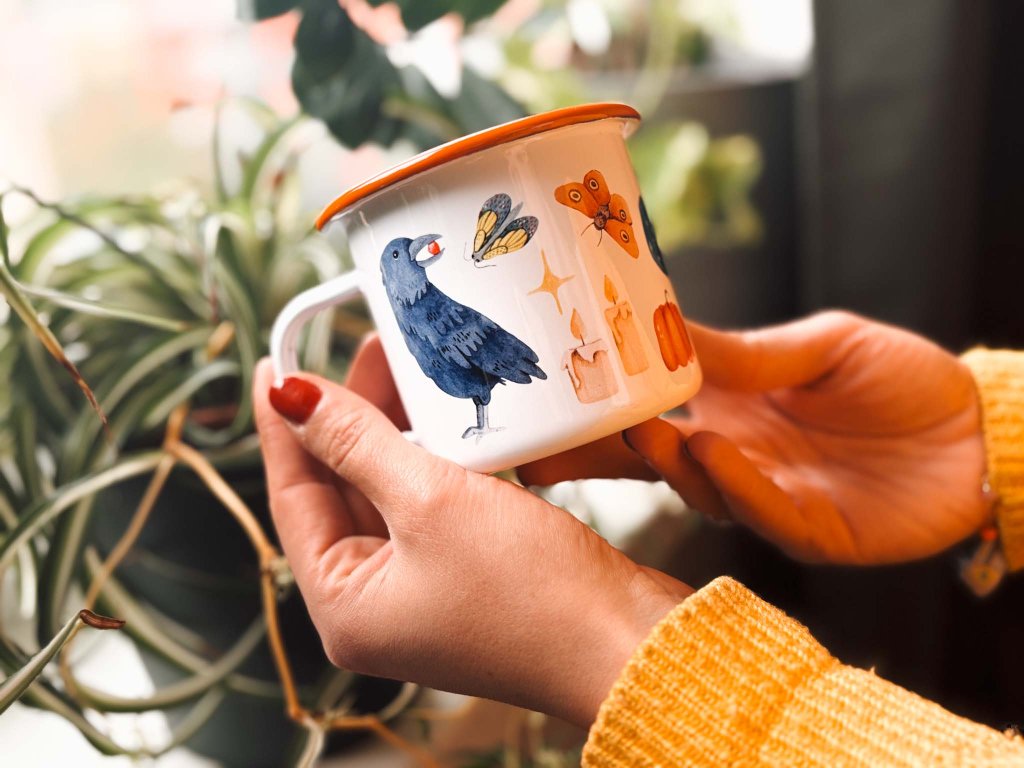 Smaltovaný hrneček neboli plecháček, který je zdobený oranžovým lemem. Plecháček je potištěn autorskými ilustracemi s havrany a dalšími čarodějnými motivy, které krásně ladí s barevným lemem plecháčku.