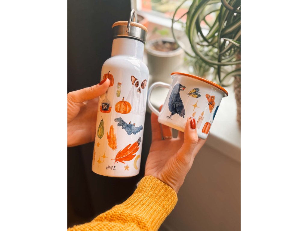 Termoláhev / bandaska z kvalitní nerezové oceli se šroubovacím bambusovým víčkem potištěná autorskou halloweenskou ilustrací. Objem láhve 500 ml.