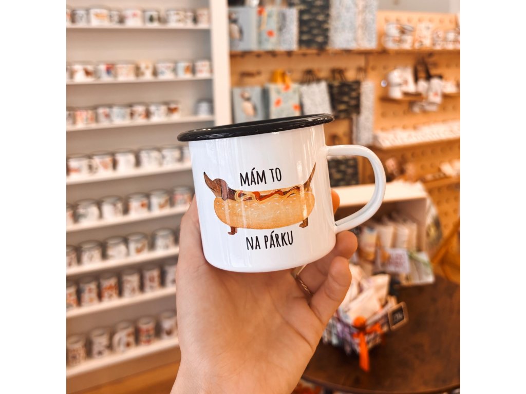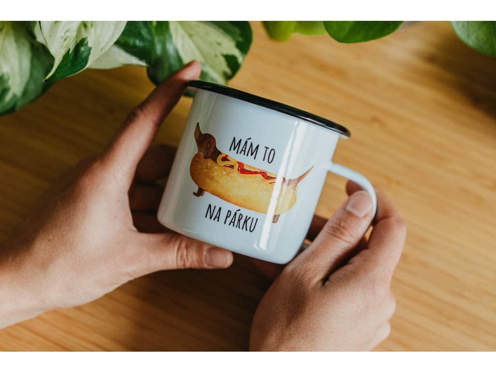 Smaltovaný hrneček neboli plecháček, který je zdobený černým lemem. Plecháček je potištěn naší autorskou ilustrací jezevčíka s textem "Mám to na párku". Plecháček je perfektním dárkem pro všechny psí mámy a táty a taky pro všechny, kteří to mají na párku :-). Plecháček můžete využít na všech Vaši výletech a cestách za dobrodružstvím, a když náhodou zapomenete misku pro pejska, můžete se s ním podělit o svůj plecháček. ;)