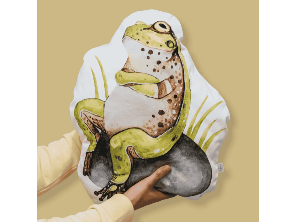 Dekorativní polštářek pro milovníky roztomilých žabek. Polštář je potištěn oboustranně a je obšitý do tvaru natištěné ilustrace. Výplň polštáře je z dutého vlákna, které je antistatické a antibakteriální. Polštář není rozepínací, výplň tedy není možné vyjmout, i přes to jej ale můžete vyprat na 30° bez použití aviváže, tvar ani tisk by se po vyprání neměl změnit.