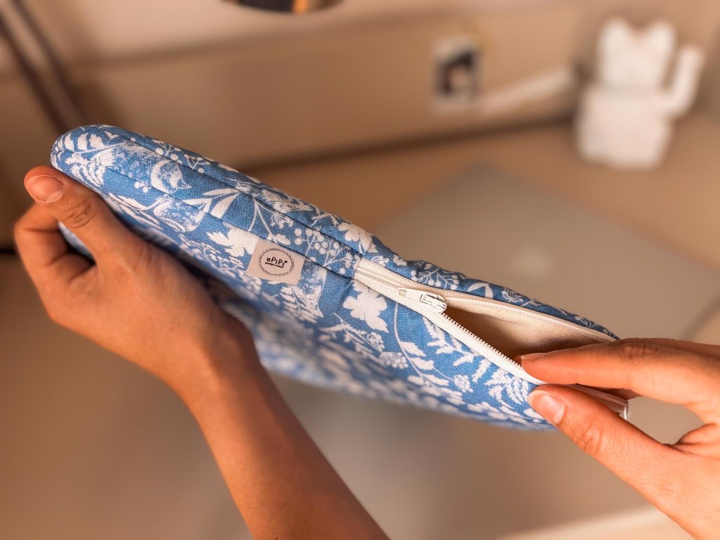Vnitřní část taštičky je ušita z režného bavlněného plátna 310g/m2 a vnější část tvoří bavlněný kepr 225g/m2, který je digitálně potištěn akvarelovými ilustracemi. Pouzdro má molitanovou a vatelínovou výplň, která uchová váš notebook v bezpečí. Obal chrání váš notebook před poškrábáním při nošení v batohu nebo v kabelce.