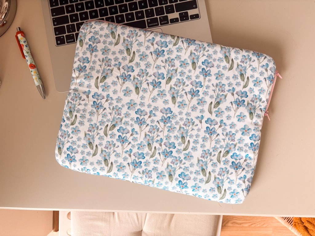 Pouzdro na notebook s potiskem pomněnek - naší nejoblíbenější kolekcí. Vnitřní rozměr pouzdra je 34 x 26 x 2 cm, vhodné pro notebooky 13″-14″