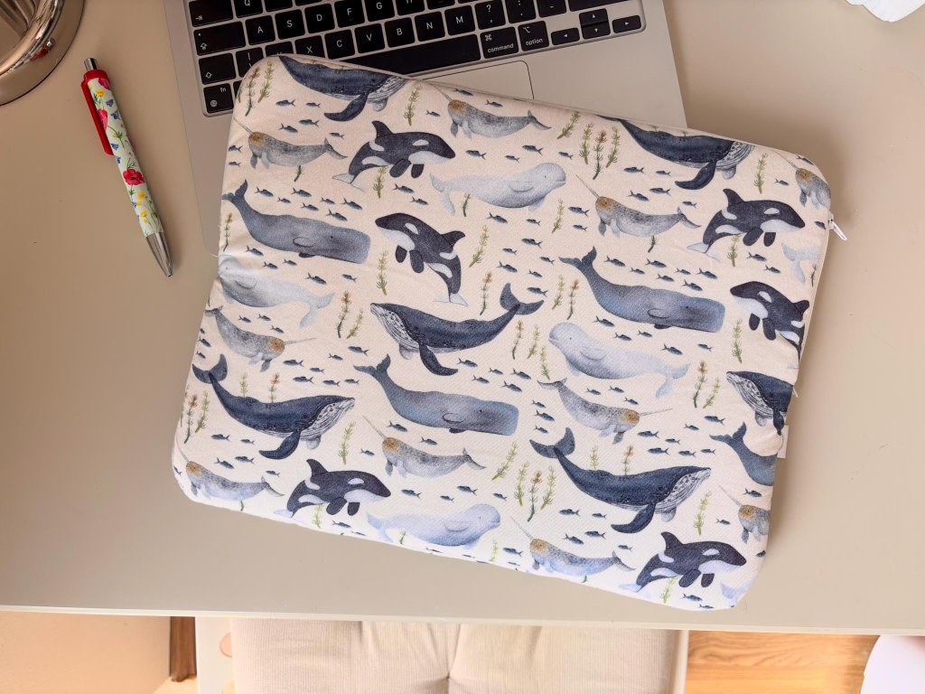 Pouzdro na notebook s potiskem velryb - jedné z nejoblíbenějších kolekcí. Vnitřní rozměr pouzdra je 34 x 26 x 2 cm, vhodné pro notebooky 13″-14″