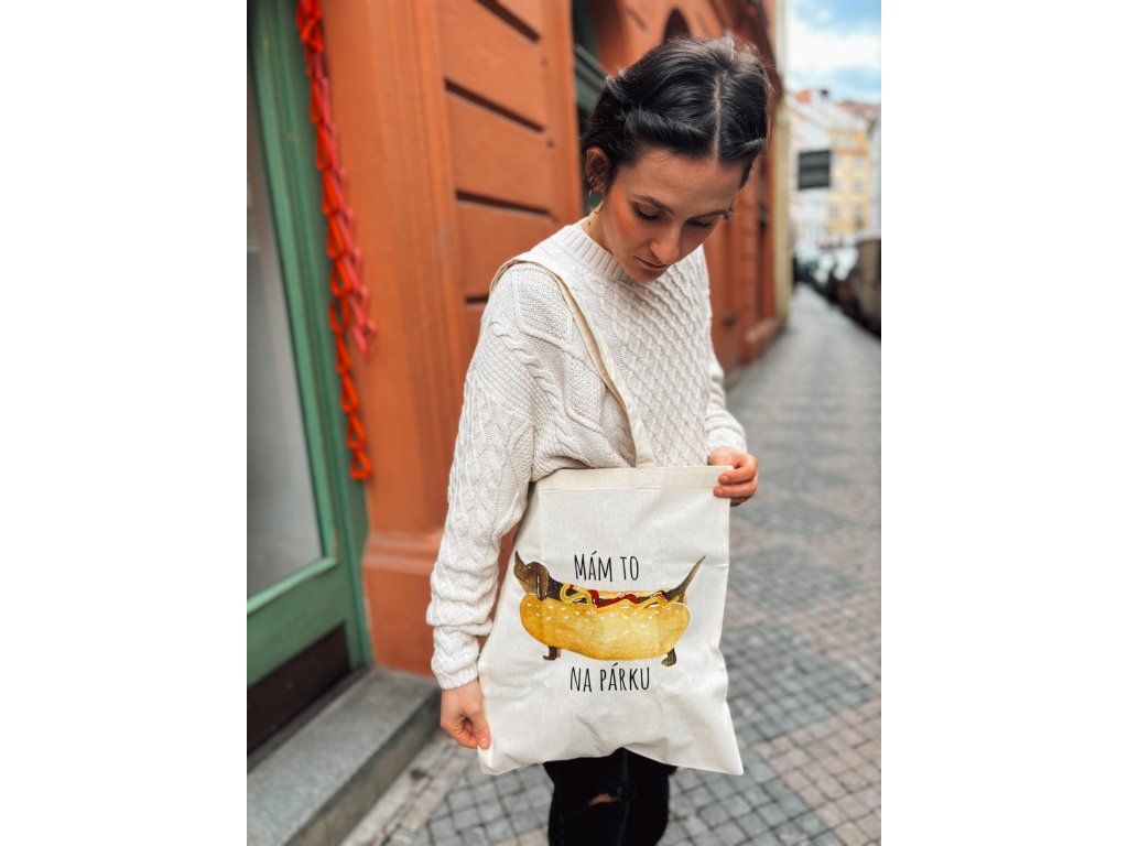 Plátěná taška s našim oblíbeným autorským potiskem jezevčíka v hot dogu a textem "Mám to na párku".