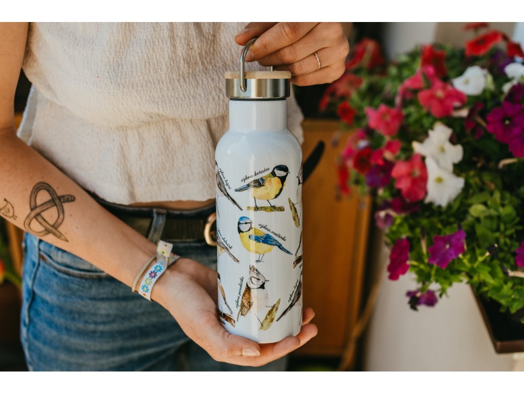 Termoska je potištěná naší autorskou ilustrací sýkorek, která byla v originále malovaná akvarelem a pastelkami. Potisk není 100% navazující - 1 cm má mezeru mezi začátkem a koncem potištěné plochy a je tvořený tak, že se na něm druhy ptáčků opakují. Konkrétně na něj přilétly sýkora modřinka, sýkora koňadra, sýkora parukářka, sýkora babka, sýkora uhelníček a sýkora lužní.