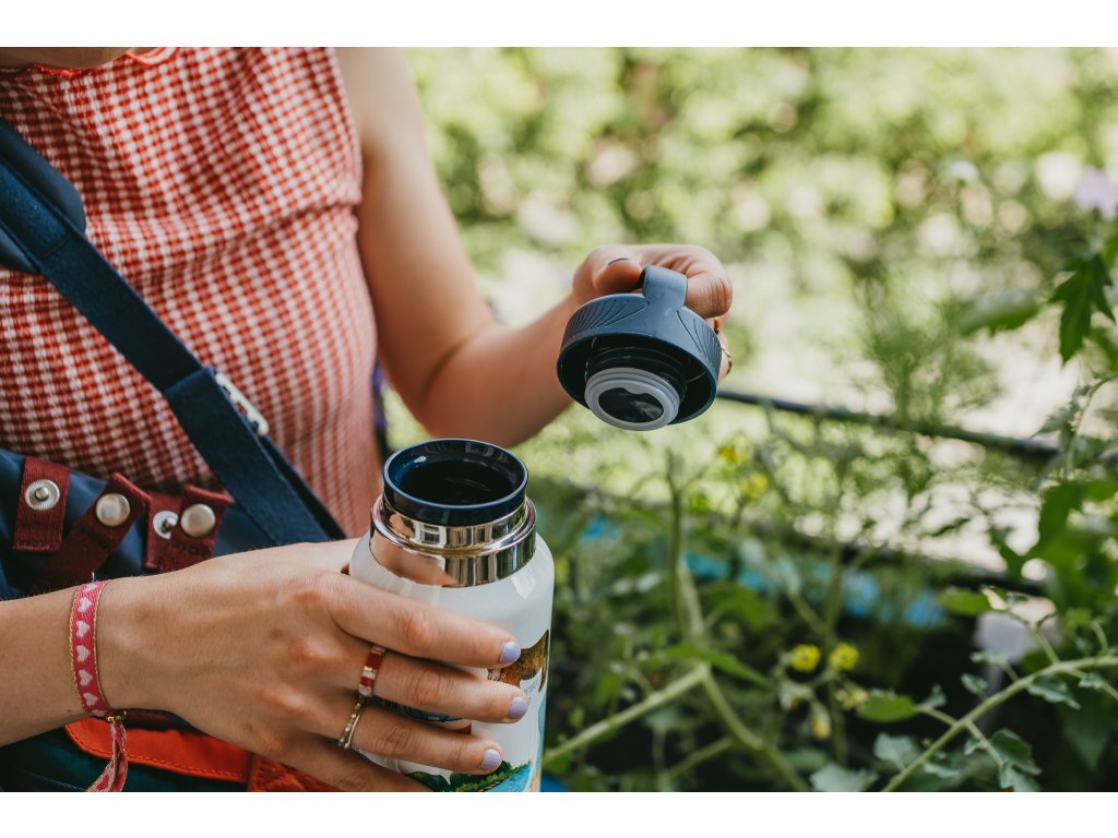 Termoska s dvoudílným modrým šroubovacím plastovým uzávěrem (včetně sítka). Termoska je ideální na horký čaj nebo kávu při dlouhých zimních procházkách. Termoska má dvojitou stěnu a zadrží tekutinu horkou až 12 hodin. Stejně dobře izoluje i studené nápoje.