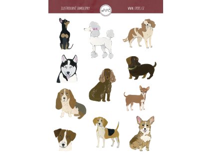 Dekorativní samolepky s autorskými ilustracemi psů. Velikost archu A6, PVC materiál.