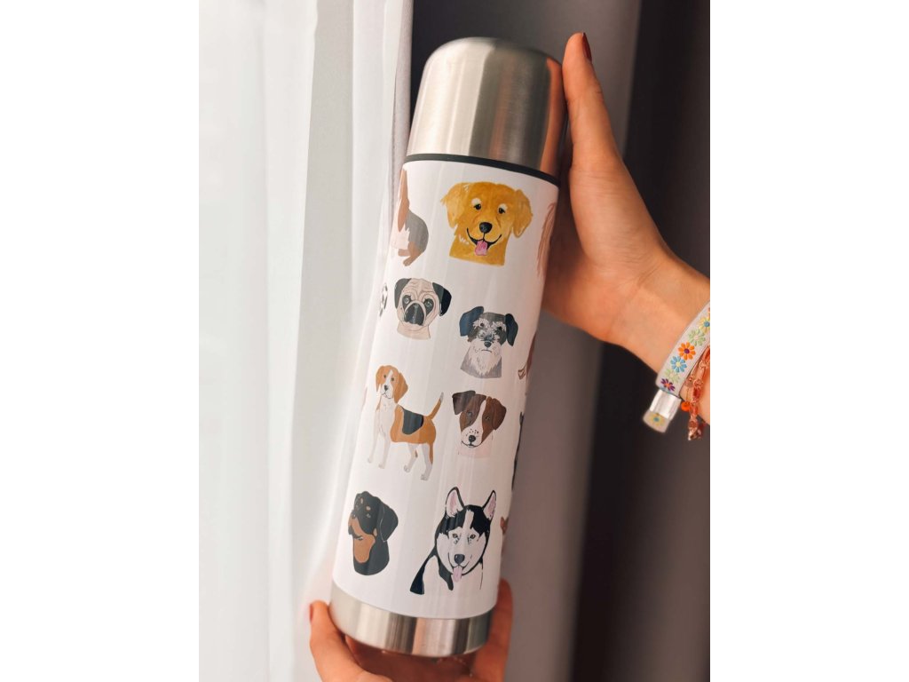 Termoska je potištěná naší autorskou ilustrací pejsků, která byla v originále malovaná akvarelem a pastelkami.