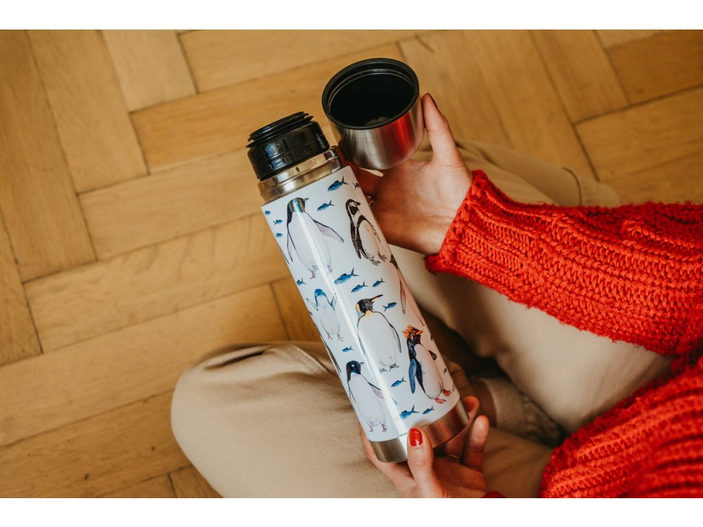 Termoska je potištěná naší autorskou ilustrací tučňáků a motiv je tvořený tak, že se na něm druhy jednotlivé druhy opakují. Ilustrace byla v originále malovaná akvarelem a pastelkami.