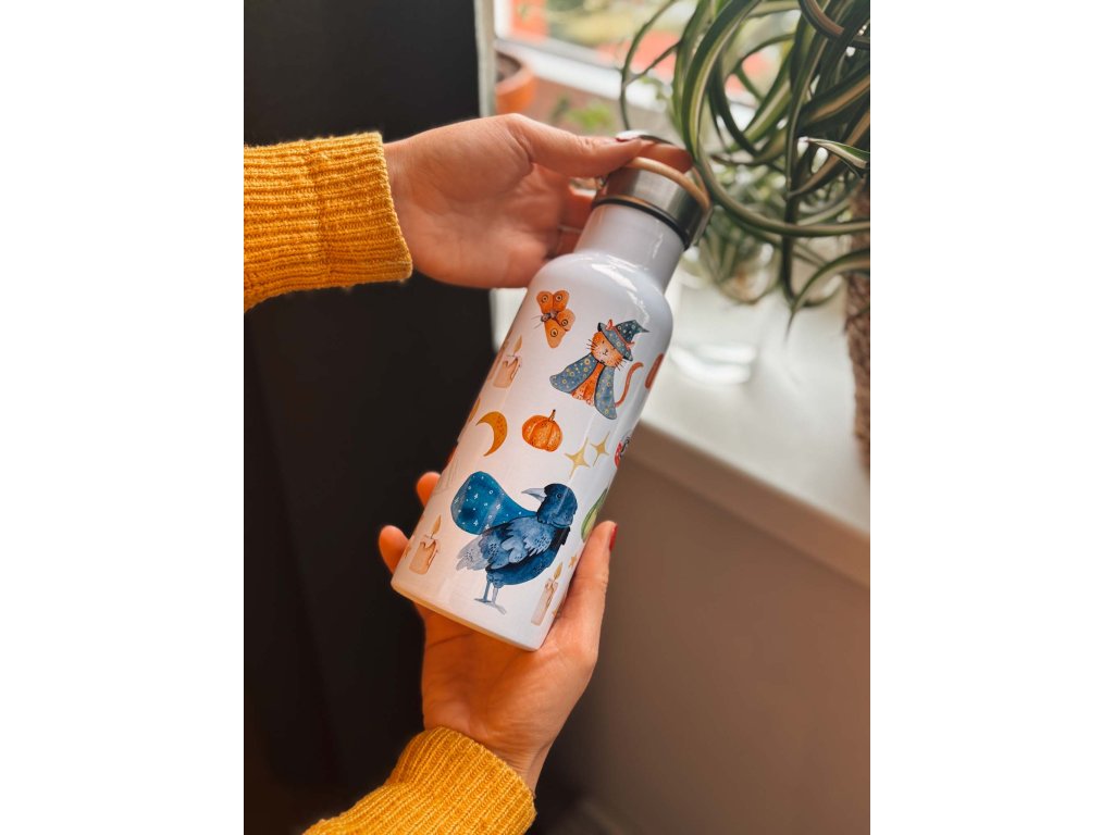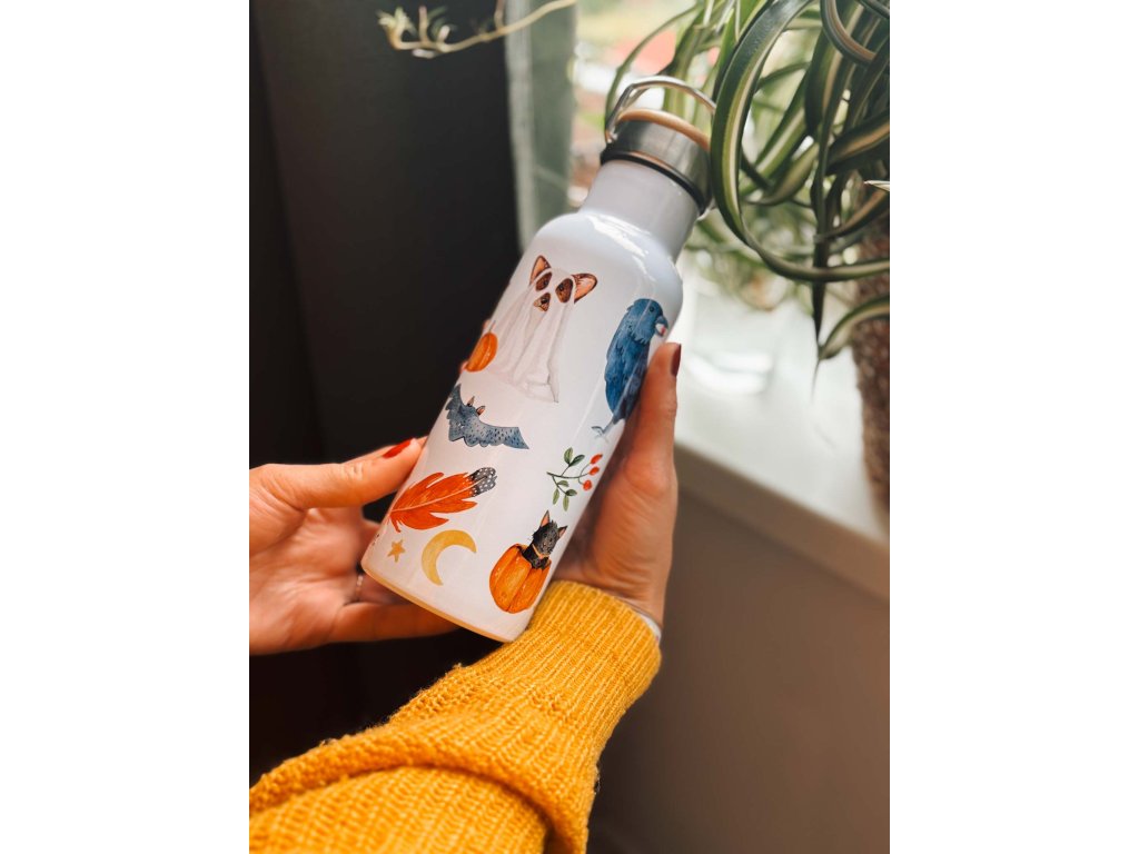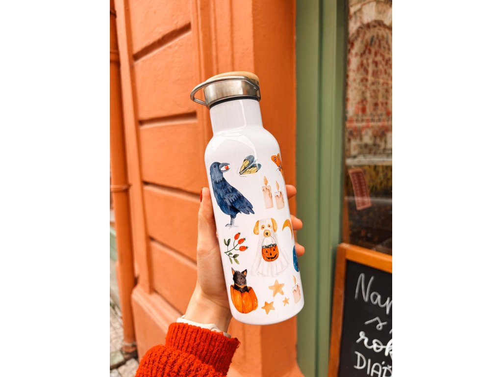 Termoska je potištěná naší autorskou halloweenskou ilustrací, která byla v originále malovaná akvarelem. Tato ilustrace patří mezi Vaše nejoblíbenější, proto jsme se rozhodli jej natisknout i na láhve, na kterých se, podle nás, krásně vyjímá.