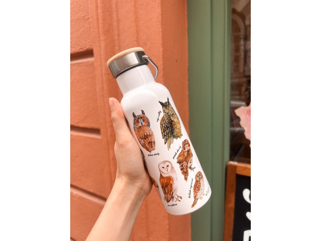 Termoska je potištěná naší autorskou ilustrací českých sov, která byla v originále malovaná akvarelem a pastelkami. Tato ilustrace patří mezi Vaše nejoblíbenější, proto jsme se rozhodli jej natisknout i na láhve, na kterých se, podle nás, krásně vyjímá. Potisk není 100% navazující - 1 cm má mezeru mezi začátkem a koncem potištěné plochy a je tvořený tak, že se na něm druhy ptáčků opakují. Konkrétně na něj přilétli sýc rousný, kalous ušatý, sova pálená, sýček obecný, puštík obecný, kulíšek nejmenší a výr velký.