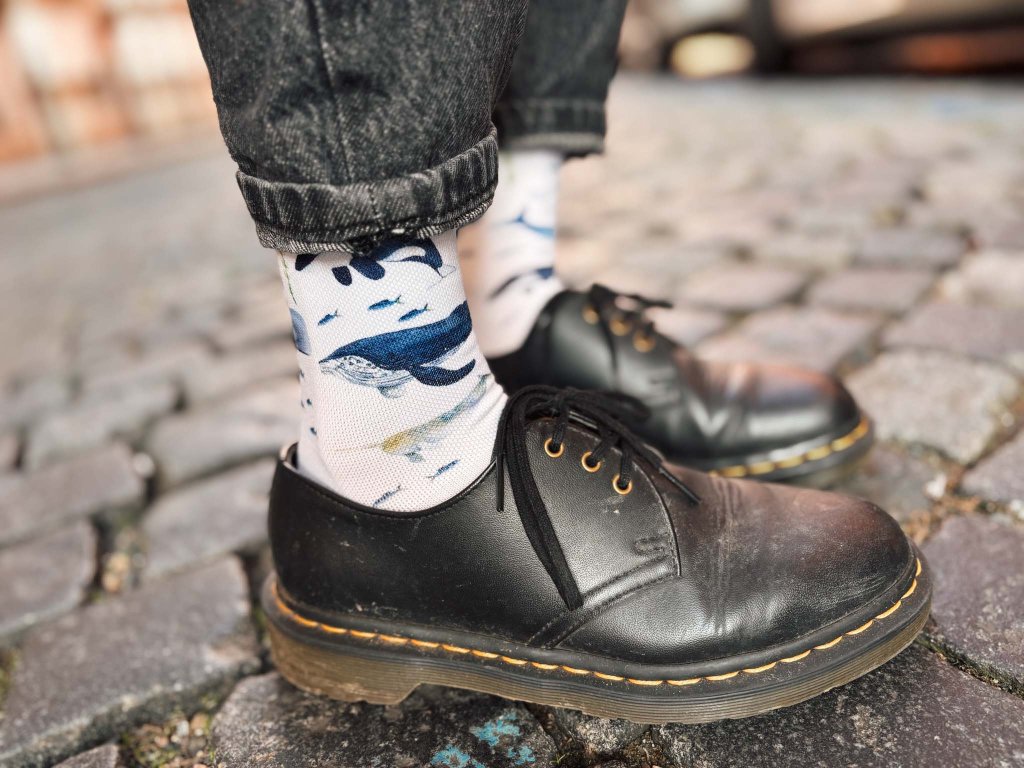 Funkční ponožky od české značky Tlapy, které zdobí náš autorský motiv s velrybami. Ponožky jsou perfektní na sportovní aktivity i běžné denní nošení. Mají antibakteriální vlastnosti, nezapáchají a jsou prodyšné. V chodidle a špičce mají prodyšnou přízi Drytex antibakterial, která dobře odvádí pot a udrží chodidlo v prodyšném prostředí.