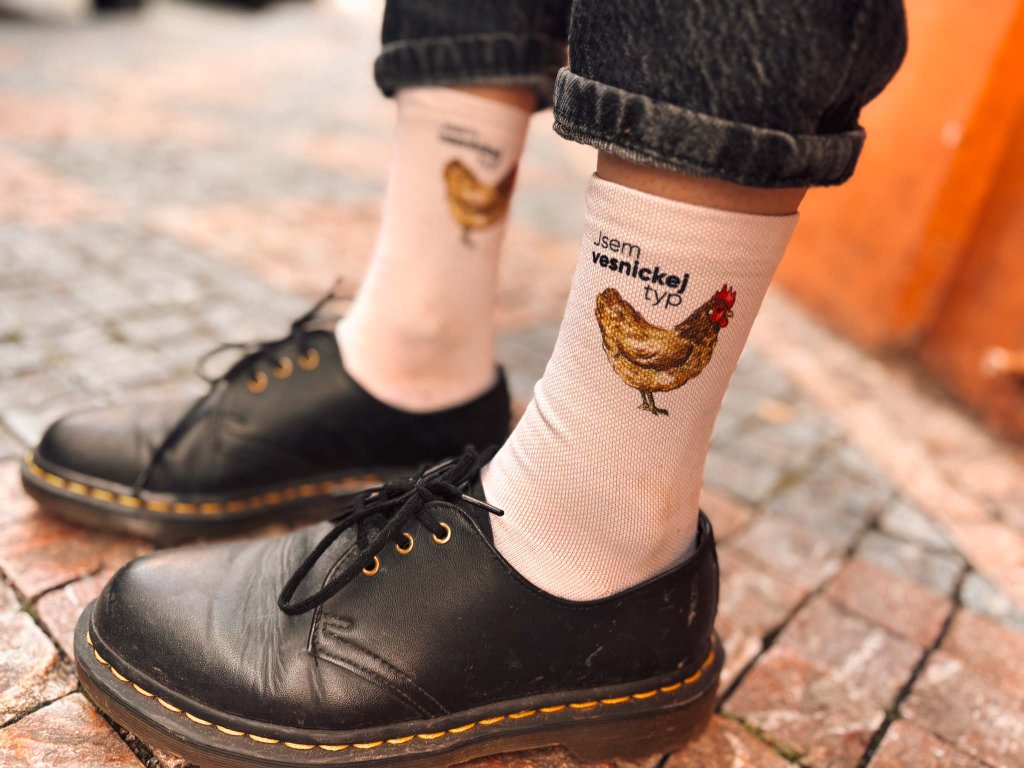 Funkční ponožky od české značky Tlapy, které zdobí náš autorský motiv se slepičkou a nápisem "Jsem vesnickej typ". Ponožky jsou perfektní na sportovní aktivity i běžné denní nošení. Mají antibakteriální vlastnosti, nezapáchají a jsou prodyšné. V chodidle a špičce mají prodyšnou přízi Drytex antibakterial, která dobře odvádí pot a udrží chodidlo v prodyšném prostředí.