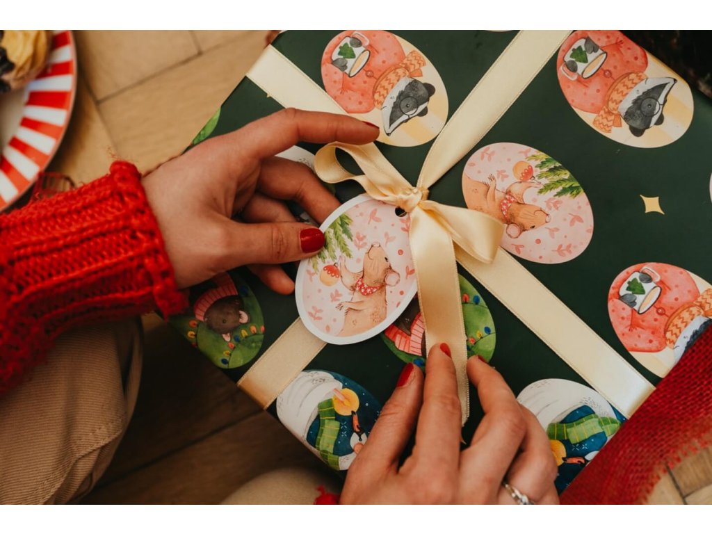 Jmenovka na dárky s autorským motivem myšky zdobící vánoční stromeček, kterou můžete sladit s naším pevným nemačkavým dárkovým balicím papírem ve stejném dekoru. Tento hravý motiv dovede vaše dárečky k dokonalosti. Skrze otvor provléknete stuhu a připevníte na dárek, který tak dovedete k dokonalosti.