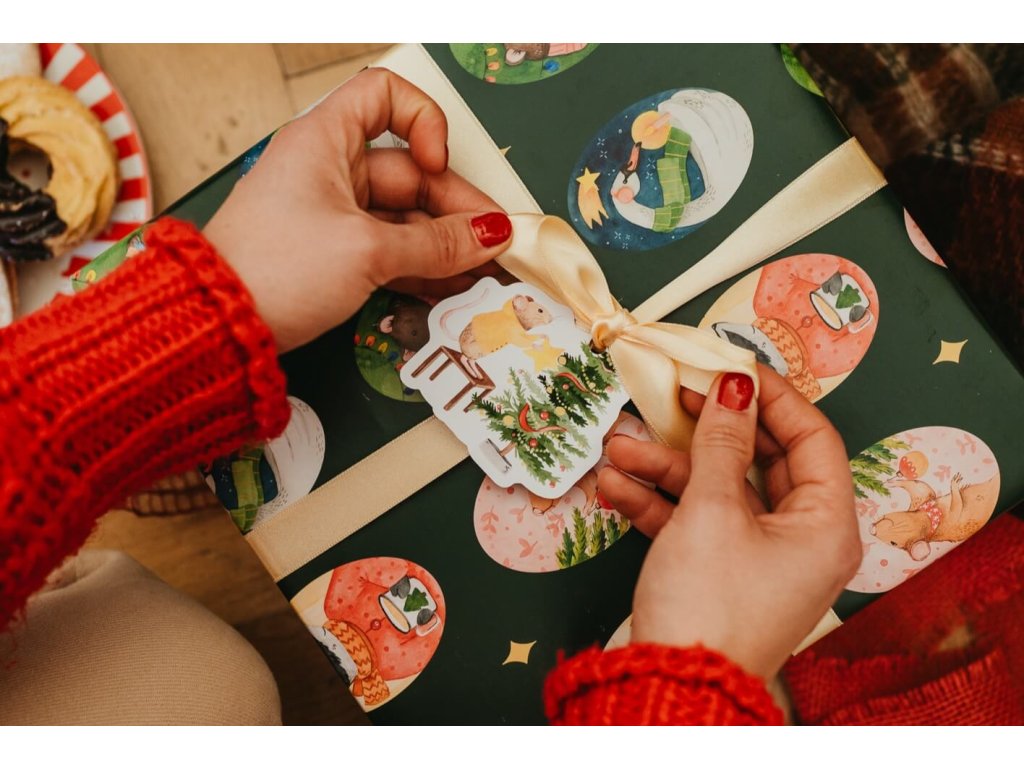 Jmenovka na dárky s autorským motivem myšky zdobící vánoční stromeček, kterou můžete sladit s naším pevným nemačkavým dárkovým balicím papírem ve stejném dekoru. Tento hravý motiv dovede vaše dárečky k dokonalosti. Skrze otvor provléknete stuhu a připevníte na dárek, který tak dovedete k dokonalosti.