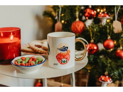 Porcelánový hrnek se zlatými detaily s autorskými ilustracemi zvířátek v rámečcích. Hrnek má objem 400 ml.