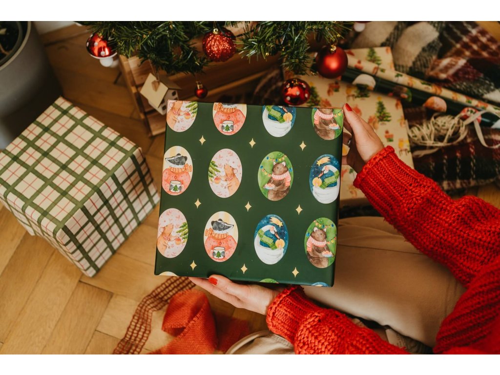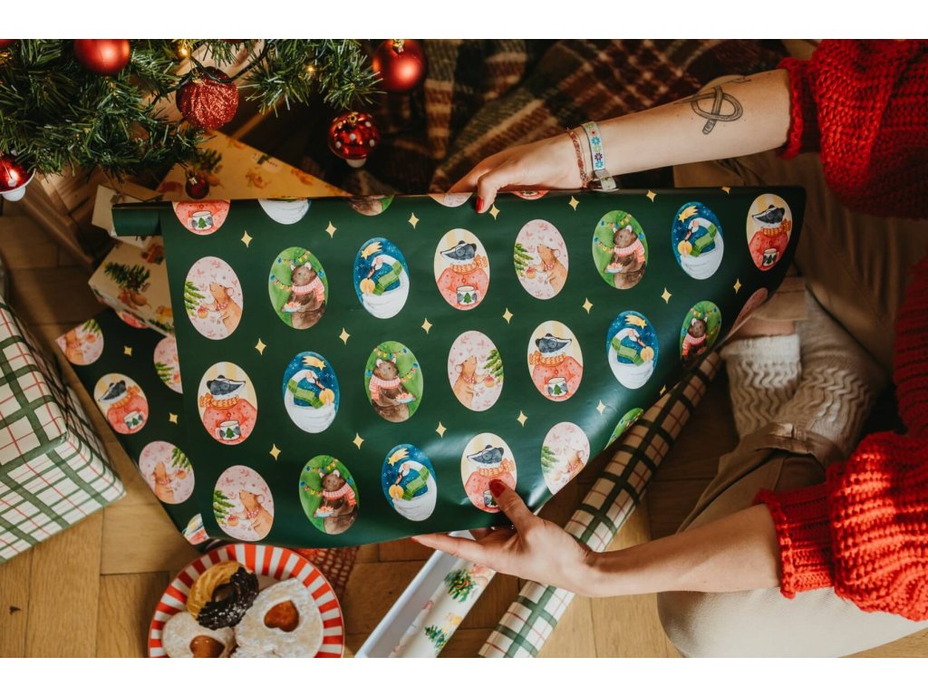 Originální balicí papír s autorskou ilustrací vánočních zvířátek v oválných rámečcích na tmavě zeleném podkladu z naší vánoční kolekce Vánoční zvířátka. Mezi zvířátky najdete jezevce s horkým čajem, medvídka s tácem plným cukroví, myšku, která zdobí stromeček a labuť se svíčkou.