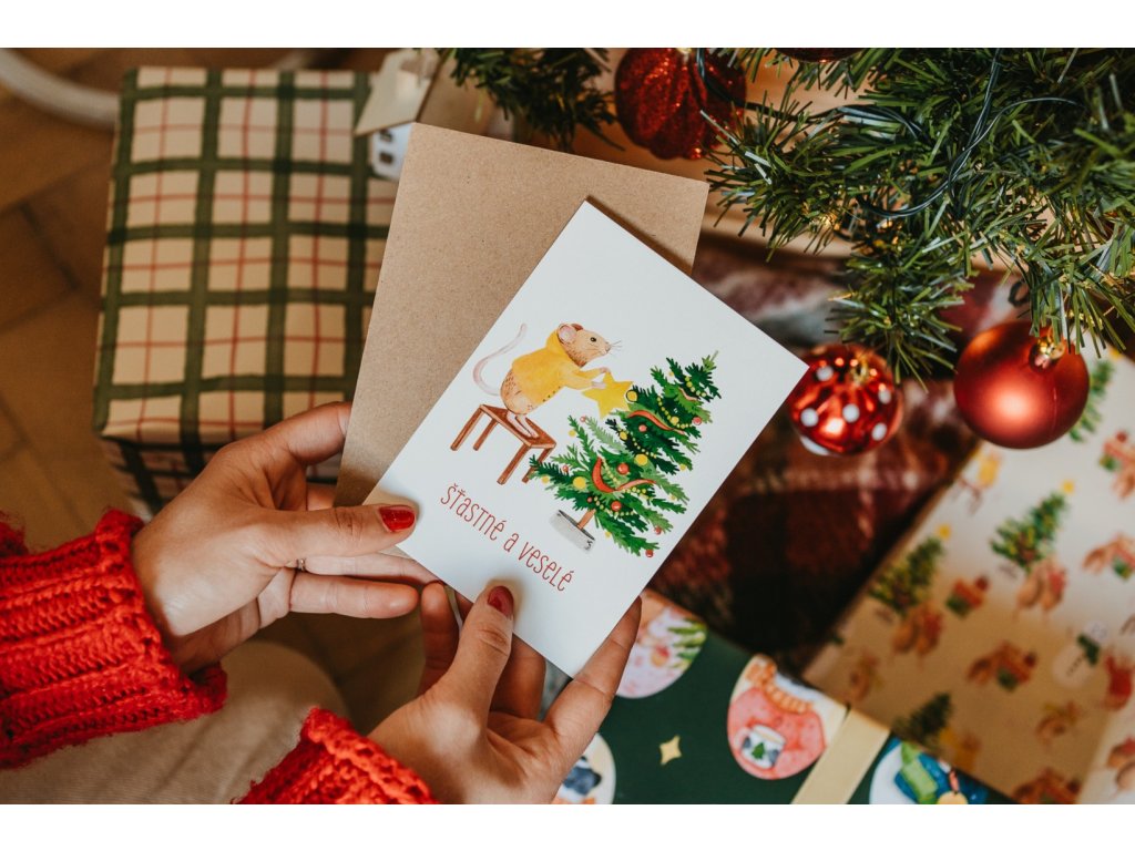 Popřejte šťastné a veselé svátky svým blízkým s našim vánočním přáním s autorskou ilustrací myšky, která zdobí vánoční stromeček. Blahopřání je jednostranné, neotevírací, jedná se o formu pohlednice. Díky tomu lze kartičku jednoduše připevnit na ledničku, vložit do rámečku nebo připíchnout na nástěnku. Z druhé strany je přáníčko čistě bílé, bez textu. Balení obsahuje obálku z recyklovaného papíru.