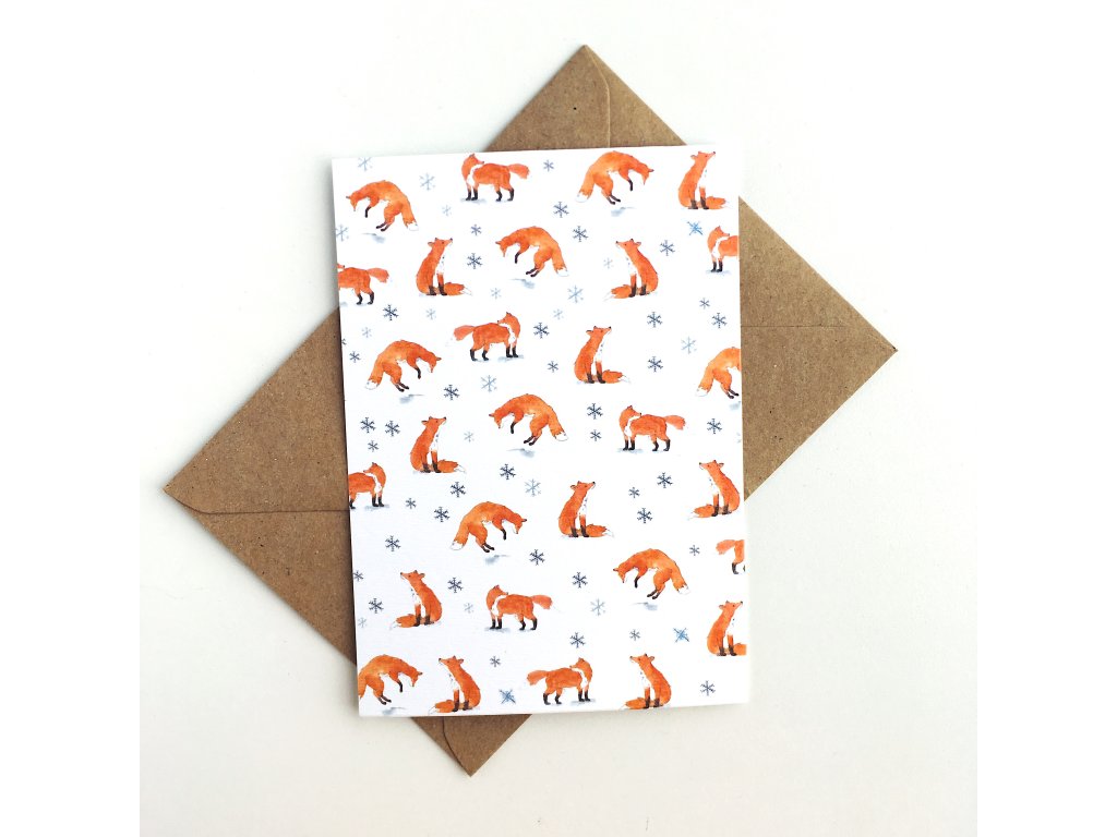 Vánoční přání s autorskou ilustrací lišek a sněhových vloček můžete zkombinovat i s naším balicím papírem a jmenovkami ve stejném motivu. Blahopřání je jednostranné, neotevírací, jedná se o formu pohlednice. Díky tomu lze kartičku jednoduše připevnit na ledničku, vložit do rámečku nebo připíchnout na nástěnku. Z druhé strany je přáníčko čistě bílé, bez textu. Balení obsahuje obálku z recyklovaného papíru.