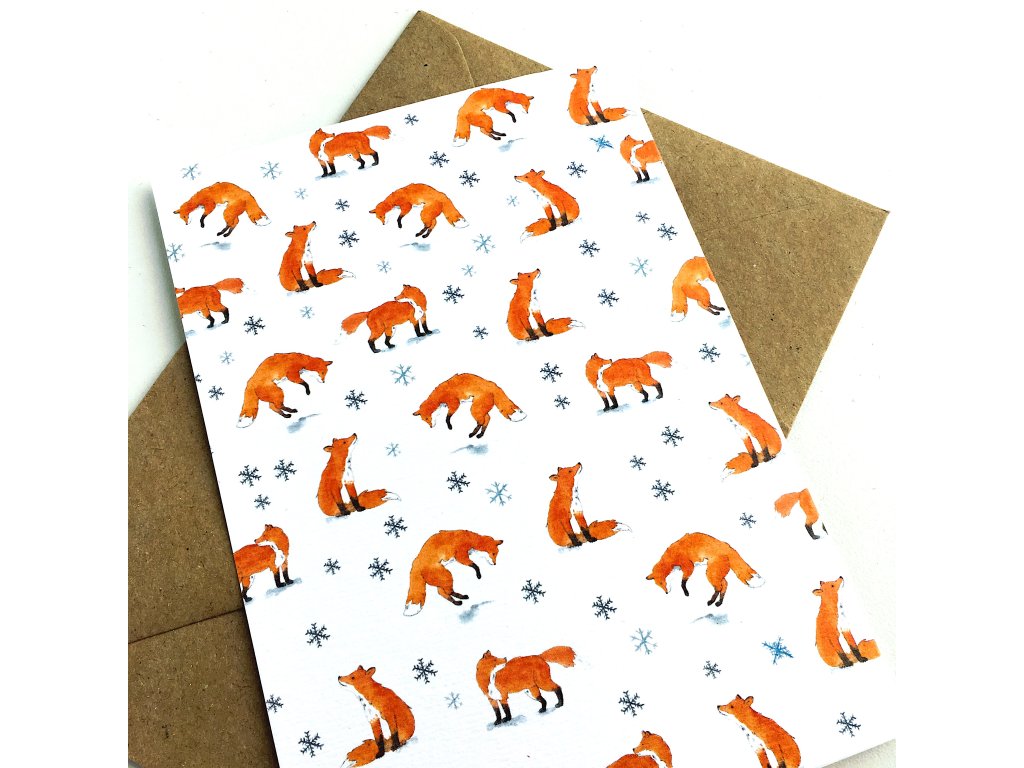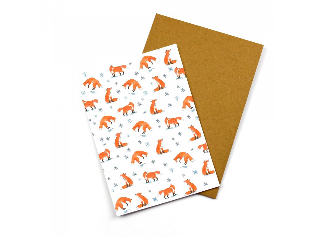 Vánoční balicí papír s autorským motivem lišek a sněhových vloček. Rozměr A1 - 841 x 594 mm.