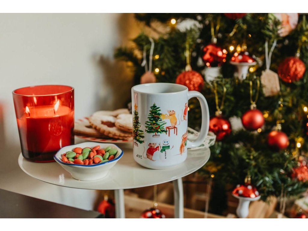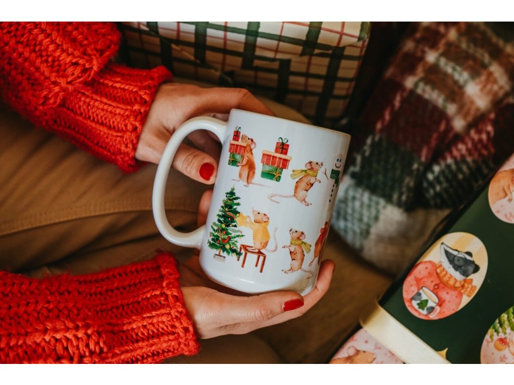 Hrnek je potištěný po celé ploše, potisk končí zhruba 1 cm od ucha a zdobí jej naše autorské ilustrace vánočních myšek. Ilustrace byly v originále malované akvarelem.