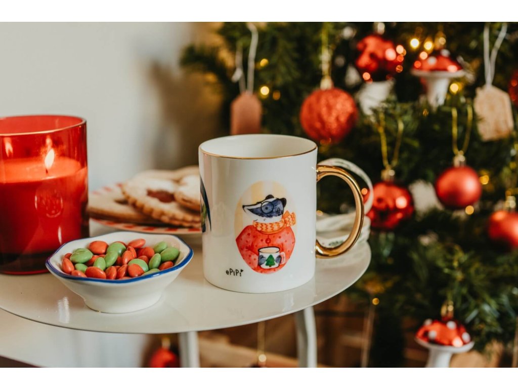 Porcelánový hrneček z naší vánoční kolekce potištěný autorskými ilustracemi zvířátek v oválných rámečcích. Hrneček má 400 ml a jeho zlatý lem a ouško mu dodávají sváteční vzhled.
