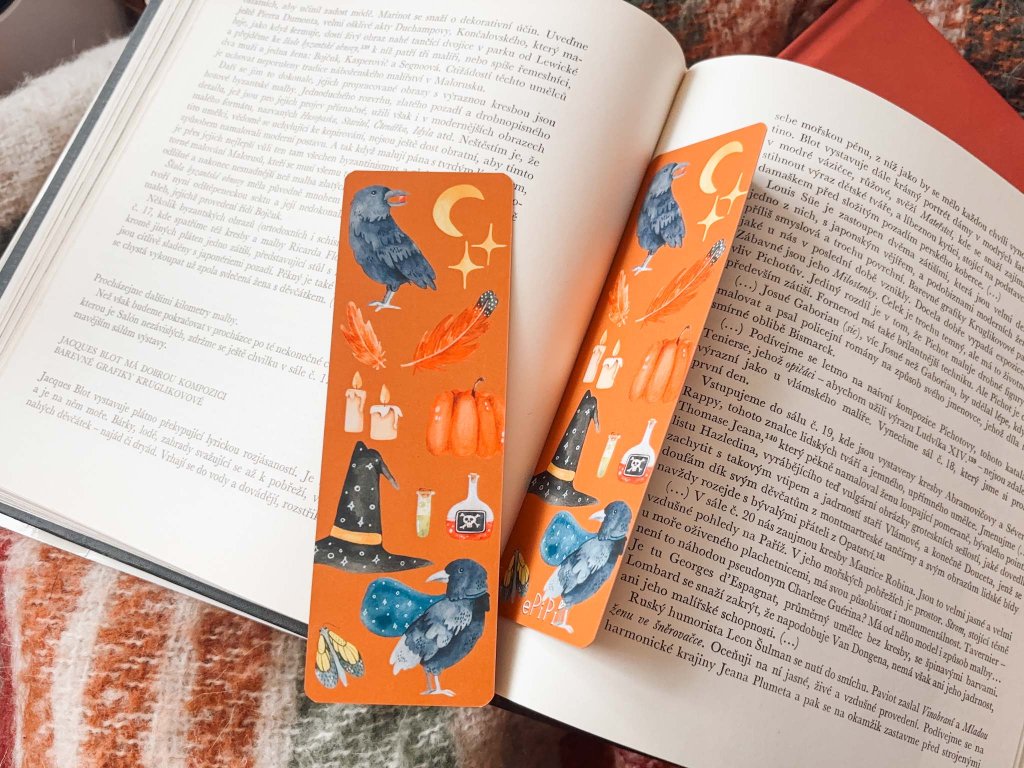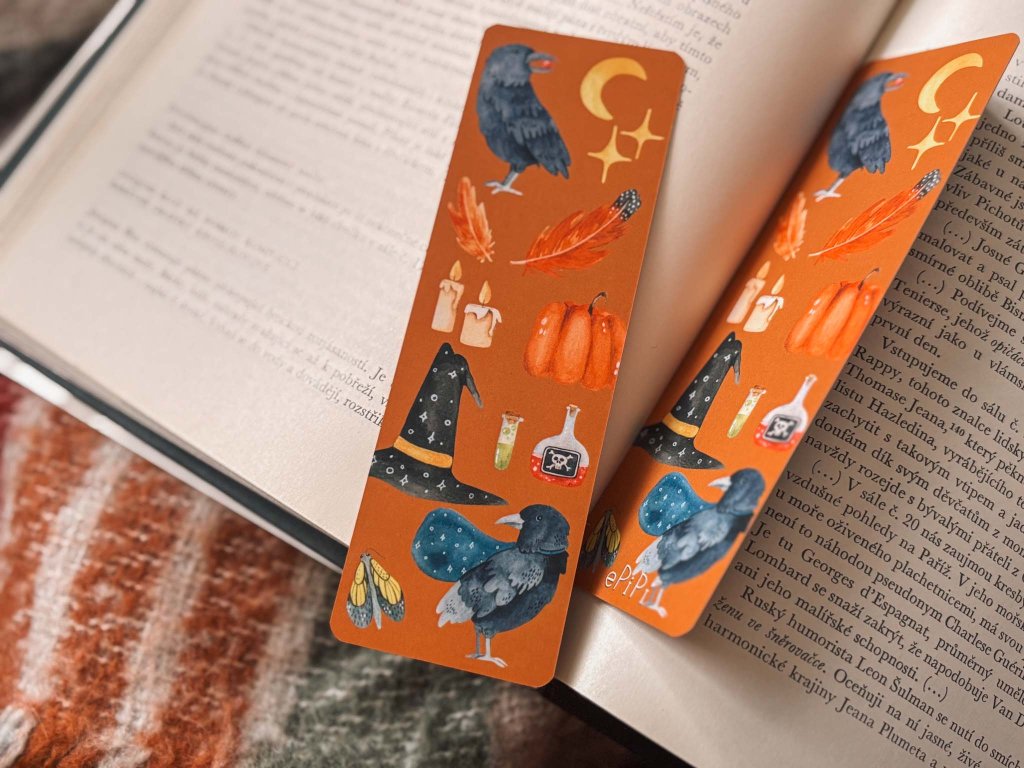 Záložka s naší autorskou halloweenskou ilustrací, která udělá radost každému knihomolovi. Je vhodná jak na založení stránek v knihách, tak třeba i v diáři nebo zápisníku.