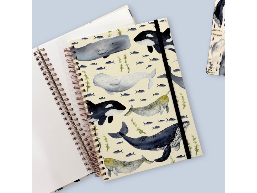 Fotoalbum v kroužkové vazbě s naším autorským designem velryb na světlém podkladu. Velikost A4, 30 listů (60 stran).
