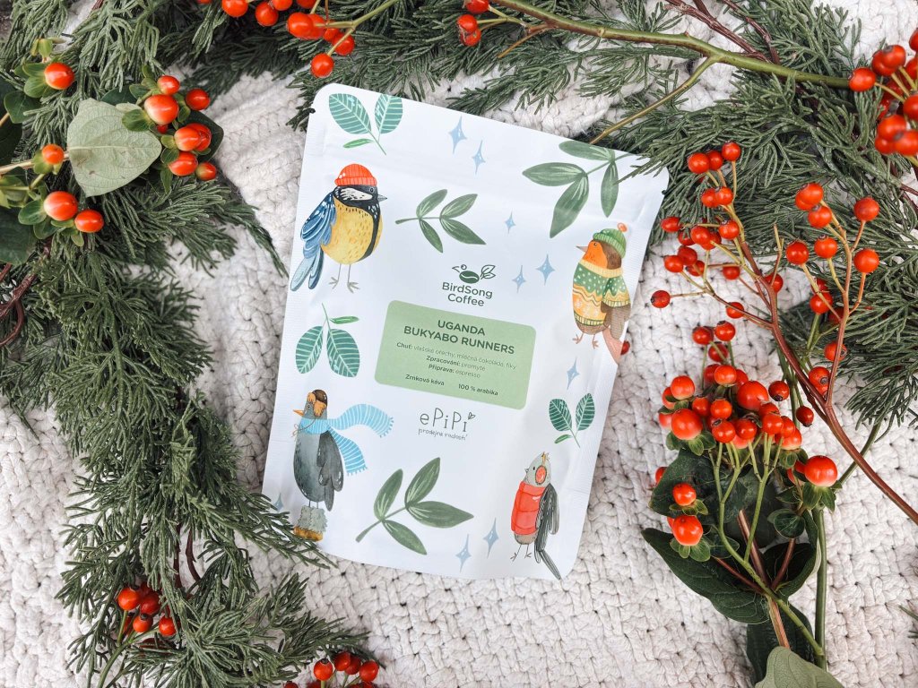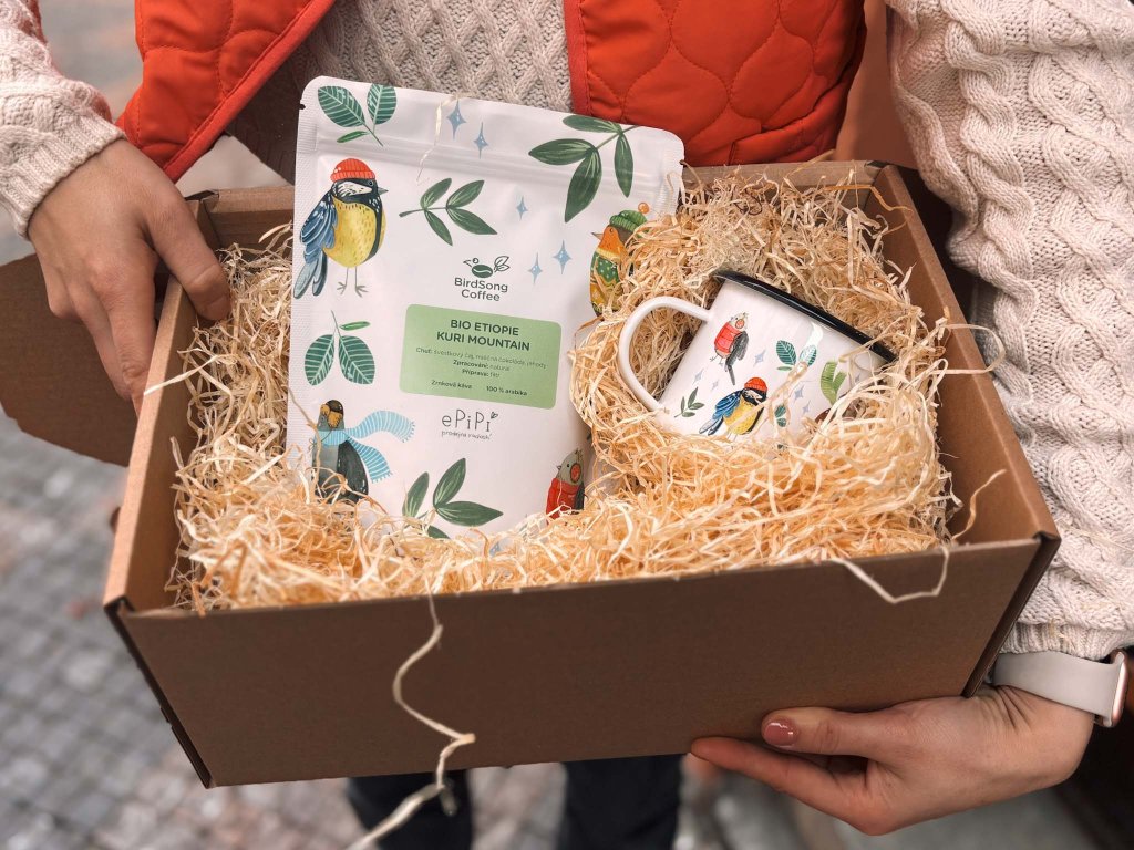 Dárková sada obsahuje sáček zrnkové kávy od pražské pražírny BirdSong Coffee (250g) s našimi autorskými ilustracemi a plecháček.