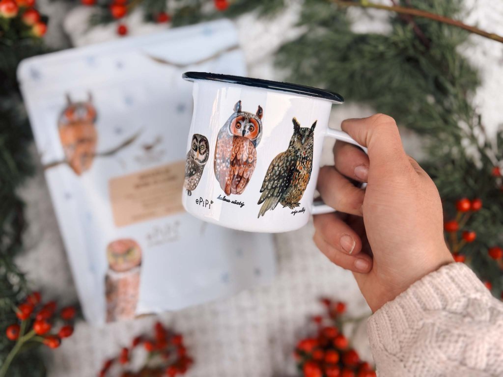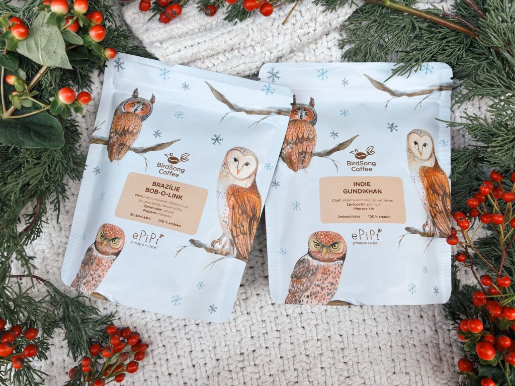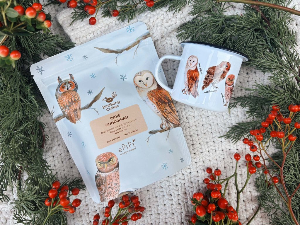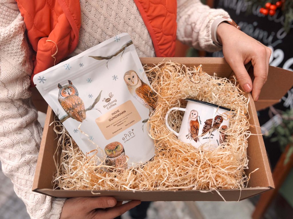 Dárková sada obsahuje sáček zrnkové kávy od pražské pražírny BirdSong Coffee (250g) s našimi autorskými ilustracemi a plecháček.